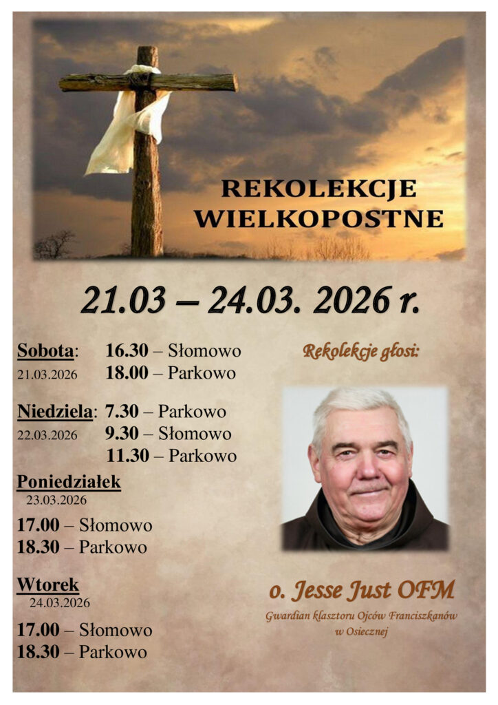 W przyszłą sobotę rozpoczną się w naszej Parafii rekolekcje Parafialne. W tym roku głosić je będzie o. Jesse Just, gwardian klasztoru ojców franciszkanów w Osiecznej. Nauki na każdej Mszy św. w sobotę i niedzielę, natomiast w poniedziałek i wtorek w Słomowie o godz. 17.00 i w Parkowie o godz. 18.30.